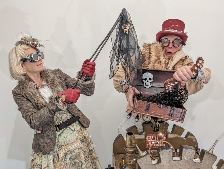 Watch them crank the starter handle and see the machine conjure up fabulous tales from out of its secret compartments – The Cabinet of Curiosities, The Book of Wishes and even from The Box of Disasters! And through the bedazzling power of The Transmission Helmet The StoryExplorers will bring these tales to life for you.